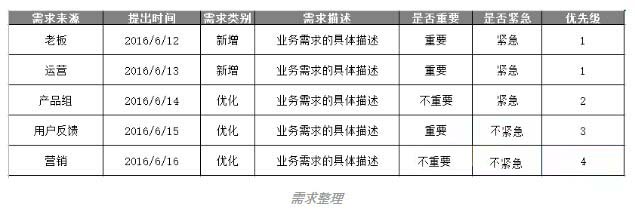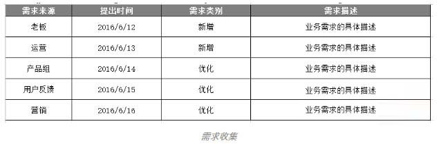 作为需求管理中的第一步工作收集需求,要做到准确记录每一个需求,不管需求是来源于老板、运营、营销、开发、用户或是产品经理自身,这一步过程中我们要做到需求不被遗漏,不被错误的记录,否则后续面对各路人员讨论需求我们会很被动。这也是作为一名产品经理基本的工作,如果这都做不好,那我们还能做好什么呢?需求收集过程中需要记录好需求的提出来源、提出时间、需求类别(新增或优化)、需求的描述,第一步需求的收集我们简单的记录在excel表中。