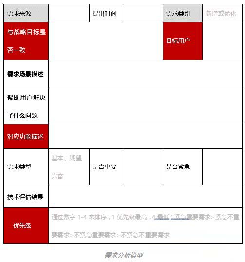 通过以上的需求分析方法我们可以清楚的知道哪些需求是要做的,以及需求实现的优先级顺序。这个时候我们将这些有效需求整理至一张表格中,记录每个需求的来源、提出时间、技术评估结果、需求的优先级(按照紧急重要程度进行1~4区分),需求整理的模板可以参照下方的需求记录表。
