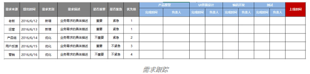 每一个被提上开发日程的需求都应该及时了解当前所处的进度状态,我们可以从原型、UI设计、开发、测试、上线几个环节掌握其进度,记录每个工作环节的负责人和完成时间。以便我们能够准确掌握每个需求的进度,评估是否可以按计划完成上线,必要的时候我们可以协调资源或以赶工的方式确保按计划进行。