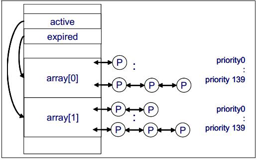 新的调度算法的扩展性非常好,不管进程的数量或者处理器的数量是多少,系统的开销都是非常少的。该算法使用两个进程优先级数组: