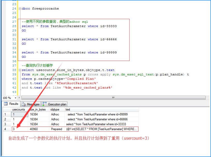 简单参数化模式下,对于有且只有一种执行方式的Adhoc SQL语句,SQL Server会自动参数化它,从而达到重用执行计划的目的。