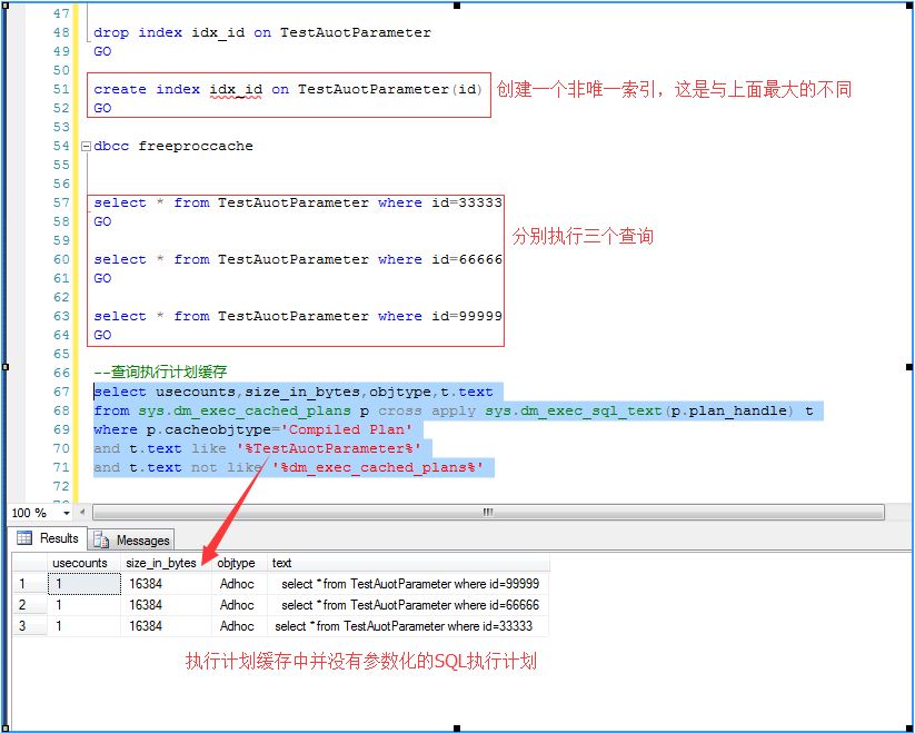 对于非索引,有可能作做引查找是高效的,有可能做全表扫描是高效的(比如某个ID的数据分布的特别多)此时执行计划有可能是多样的,不仅仅只有一种方式,所以不会自动参数化SQL