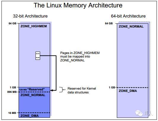 在32位的架构上,如IA-32,Linux内核只能直接访问物理内存的前1GB(当考虑部分保留是为896MB)。所谓的 ZONE_NORMAL之上的内存必须要被映射到1GB以上的内存中。该映射对于应用来说是完全透明的,但是在ZONE_HIGHMEM中申请内存页会导致一个性能的稍微下降。
