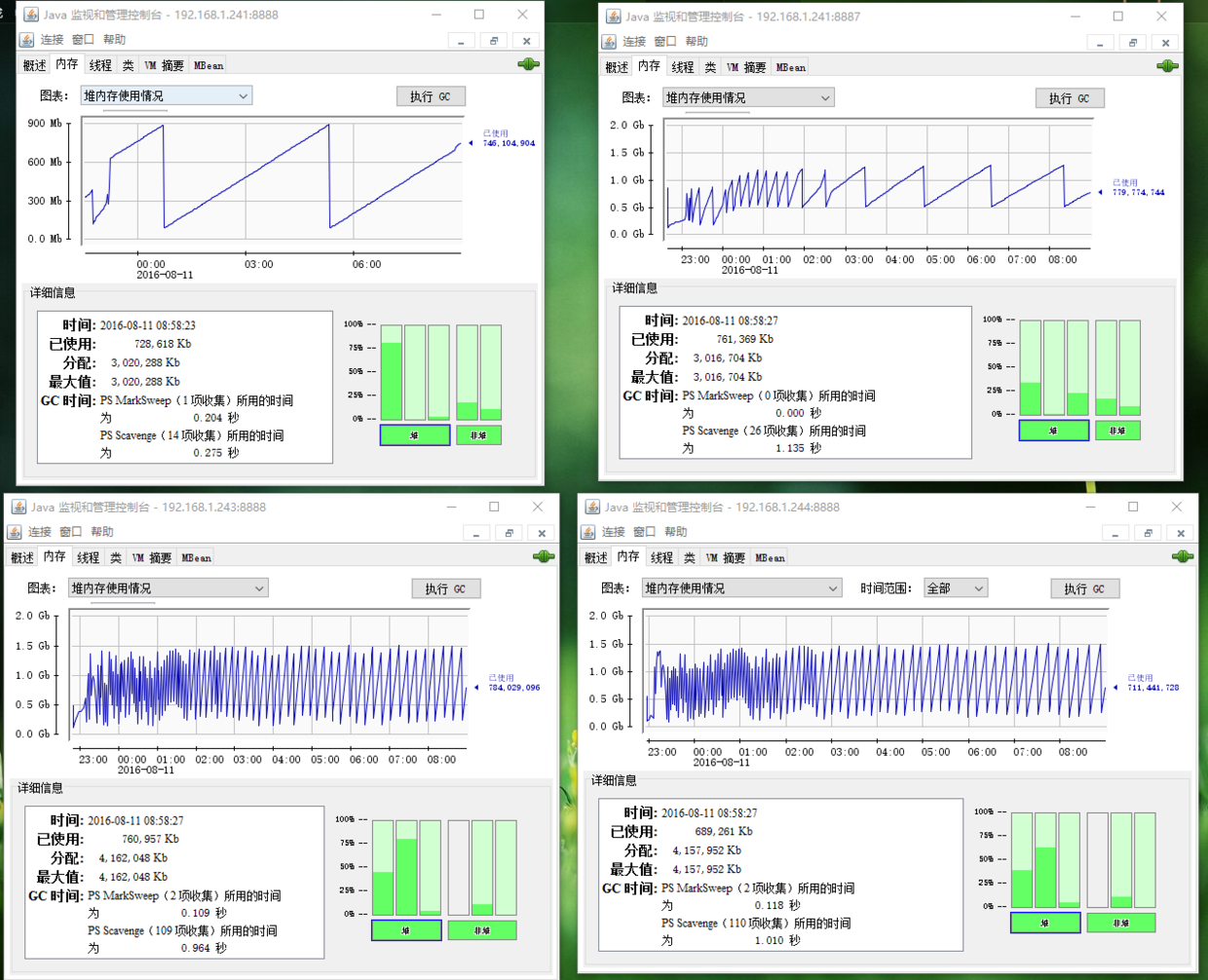 监控Provider和接口服务器的堆内存,当曲线呈正常波形,上升到一定值的时候,会自动GC,回落到正常范围内说明正常的,如果一直处于上升呈抛物线,说明存在内存泄露