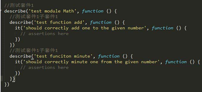 对于mocha, 一个测试用例必定包含 describe和 it,来实现一个测试用例的具体模版 describe块 称为"测试套件"(test suite),表示一组相关的测试。 it块 称为"测试用例"(test case),表示一个单独的测试,是测试的小单位