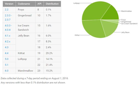 谷歌新发布的Andriod系统版本构成显示,新版的Andriod系统棉花糖版本在发布十个月后占比突破15%。据悉,谷歌新版的Andriod操作系统棉花糖版本在经过十个月的缓慢增长后占比终于突破了15%。此前其经过四个月的推广占比突破1%,发布八个月后占比突破10%。根据新统计数据,上月棉花糖版本占比增长了1.9%,达到15.2%,位列占比第四位。