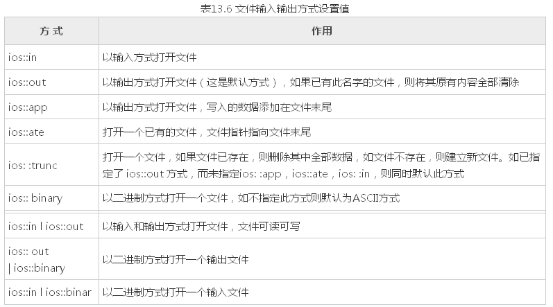 输入输出方式可以使用能够进行组合使用的,以“或”运算(“|”)的方式,如:fstream fout(fname,ios::out|ios::in)