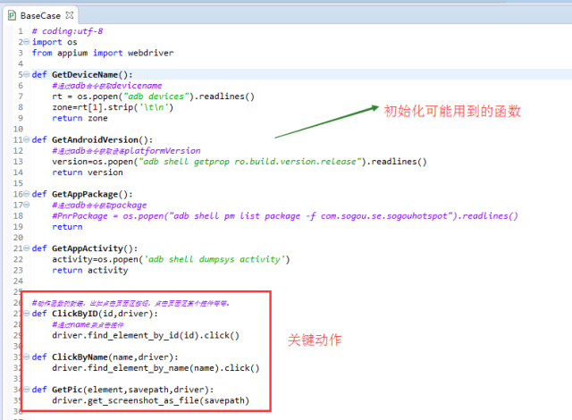 这里,我封装一个BaseCase.py的底层库,里面对一些动作和我希望实现的功能做一下封装,回头在自动化case中会调用这个库: