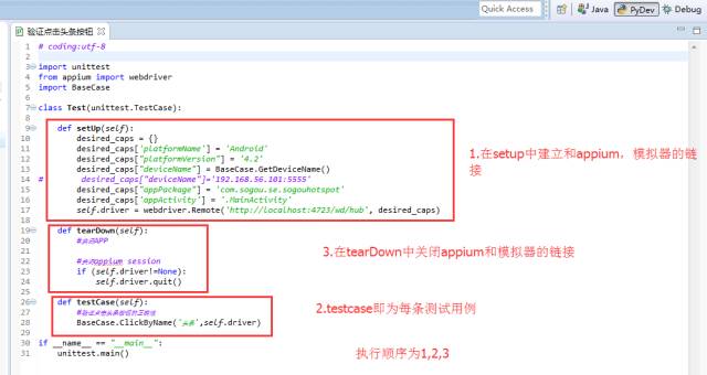 Setup中建立appium和模拟器连接的部分,在以前的文章中讲过了,不解释。