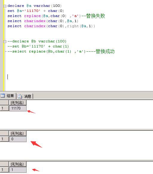 原来如此,charindex都找不到它,得right一下才把这根刺挑出来。当是char(1)等等的时候是可以的,replace(@a,char(1) ,’a’)
