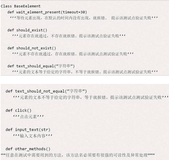 · 将上面分析得到的核心行为都封装成基类方法。然后确保,任何一个页面元素都继承该基类。