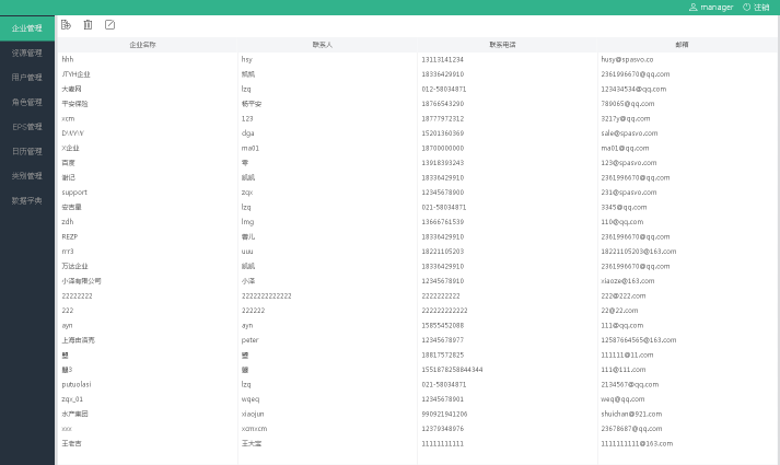 TestCenter后台管理有企业管理、资源管理、用户管理、角色管理、EPS管理、日历管理、类历管理和数据字典。