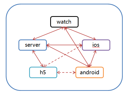软件技术的不断革新,促使软件领域增多,针对智能手表领域,它涉及到的软件领域包括:智能手表端、服务器端、android应用端、ios应用端、H5网页端。以下,是它们之间的沟通关系图: