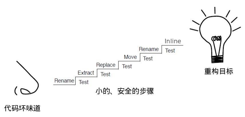 我们学习重构,是要来学习每种场景下所使用的小步安全的重构手法及其使用顺序,并不断加以练习! 能够灵活而流畅地使用一系列重构手法完成一项重构,是衡量重构能力的一个非常重要的指标.
