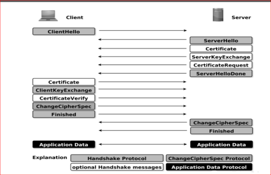 Handshake协议:包括协商安全参数和密码套件、服务器身份认证(客户端身份认证可选)、密钥交换;