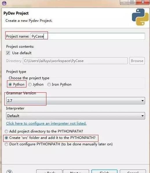 进入 Pydev 透视图,在 Eclipse 菜单栏中,选择 File > New > Project > Pydev > Pydev Project,新建项目:PyCase,单击 Next。