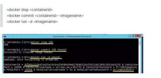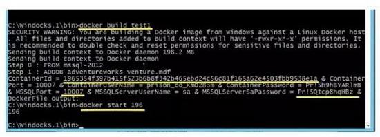 第二步: 输入 >docker build c:WindockssamplesTest1 WinDocks客户端返回包含容器ID、端口和SQL Server sa密码的字符串。