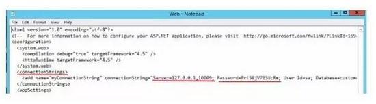 这里我们使用WinDocks中位于windockssamples estdotnet目录的示例.NET应用来举个例子。使用记事本打开web.config,配置“连接字符串”,指向SQL Server容器的主机地址、端口和SQL认证信息。