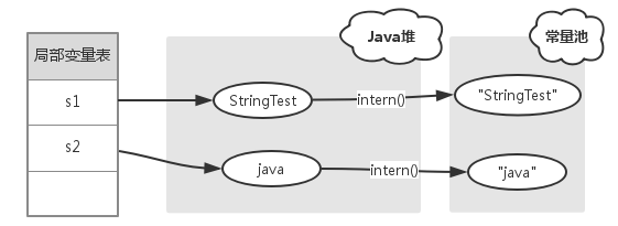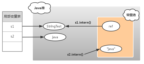 对于变量s1,常量池中没有 “StringTest” 字符串,s1.intern() 和 s1都是指向Java对象上的String对象。