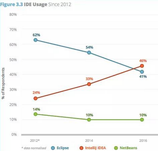 根据今年 6 月份的一份调查,Eclipse 的使用比例下降至 41%,已低于 Intellij IDEA 的 46%。
