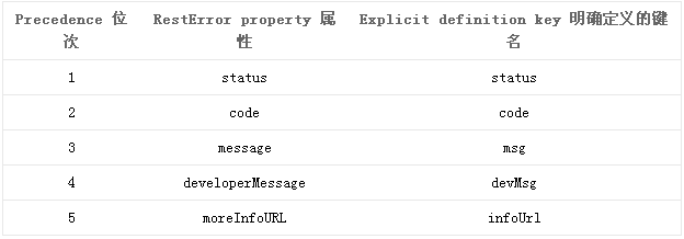 后,需要注意的是,由于这些定义都是简单的键/值对,如果你的项目有很多这样的定义,好将他们定义到一个 .properties 文件中,而不是在 Spring 的 XML 中。可以在启动时使用一些轻微的胶水代码或配置来读取那个文件,并作为 Map 放到 DefaultRestErrorResolver 中。