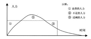 在实际情况中,软件项目的人力资源分配大致符合Norden-Rayleigh曲线分布。①区域代表开始阶段,人力过剩;②区域表示开发的中后期,人手不足;③区域表示后来的补偿时间过晚,反而会出现Brooks定律的情况:“向一个已经拖延的项目追加新的开发人员,可能会使这个项目完成得更晚”。因为作为新加入的员工来说,相关培训、环境熟悉和人员之间的沟通通路的增加,迫使项目的工作效率急剧下跌。工作效率下降需要加班来进行弥补,但加班造成的疲劳会再次使工作效率降低。同时工作成本却不断的向上攀升。