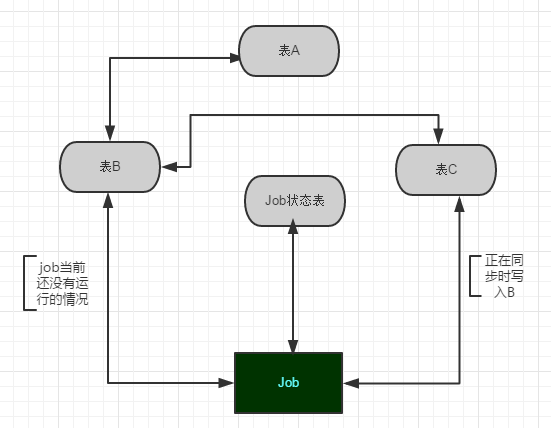 3.建立同步数据的作业Job1和记录Job1运行状态的表,在同步的时候比较关键的是需要检查Job1的当前状态,如果当前正在将B的数据同步到A,则把服务端过来的数据存到C,然后再把数据导入到B,等到下一次Job执行的时候再将这批数据转到A。如图1: