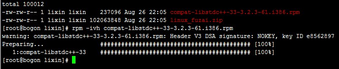 [root@bogon lixin]# rpm -ivh compat-libstdc++-33-3.2.3-61.i386.rpm