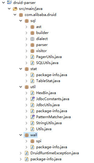 一开始的做法当然是“暴力删除”,通过对代码的整体浏览,大概判断出哪些 package 与 SQL 解析有关,其余的直接删除。这样做会有些问题,比如说直接删除后在 IDE 中会立马浮现一些小红叉叉,但令人感到愉悦的是,Druid 的模块分解做得十分,SQL 解析模块基本上作为一个工具模块,与其它模块实际上是分离的。