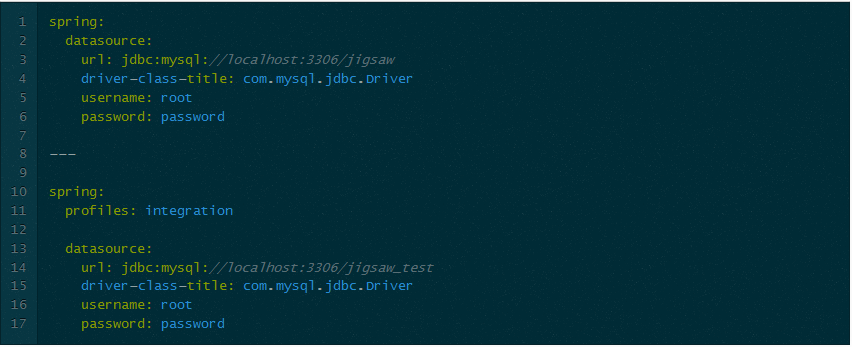 如果使用Spring,还可以通过profile来切换不同的数据库。比如下面这个例子中,默认的profile会连接数据库jigsaw,而integration的profile会连接jigsaw_test数据库: