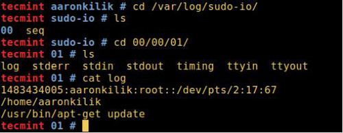 $ cd /var/log/sudo-io/ $ ls $ cd 00/00/01 $ ls $ cat log