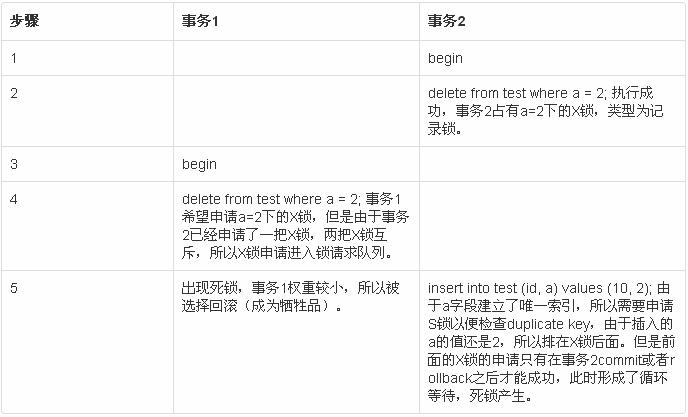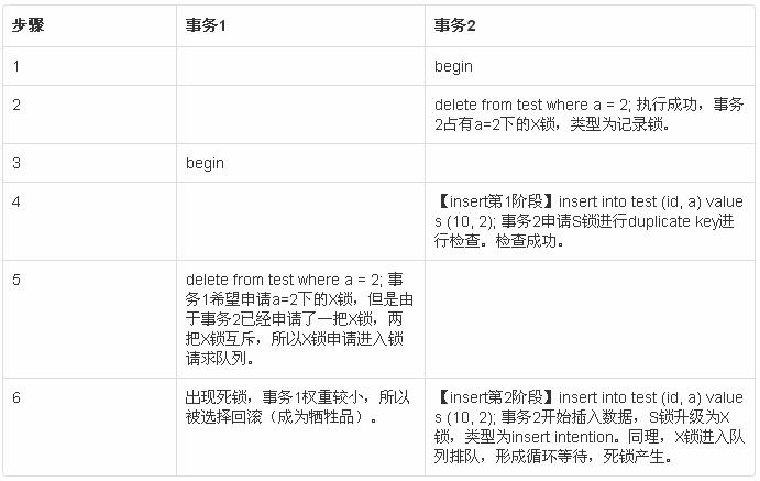该死锁对应的日志这里不贴出了,与上一个死锁的核心差别是事务2等待的锁从S锁换成了X锁,也是lock_mode X locks gap before rec insert intention waiting。我们还是通过表格来详细说明该死锁产生的流程: