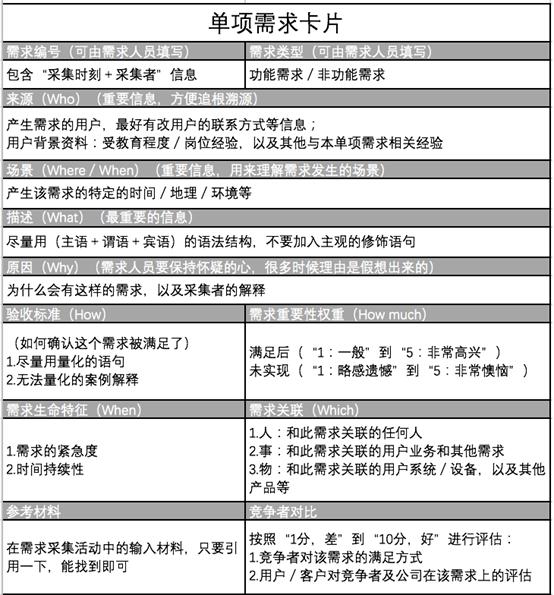 需求管理可使用用户画像形式(或单项需求卡片)进行规范化整理,也可以使用需求池进行统一管理。这两种方法不作具体介绍,可参考下面图片