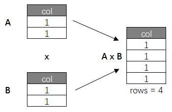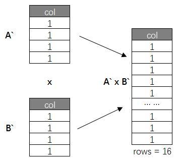 sql中,通过cross join 可以把两个table (如 A ,B )组合,形成一个笛卡尔积,如图1