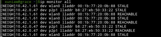 也可以使用ip命令查看netlink消息。monitor选项允许你查看网络设备的状态。比如,所在局域网的一台电脑根据它的状态可以被分类成REACHABLE或者STALE。使用下面的命令: