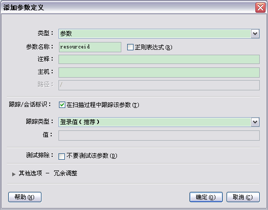 新建扫描文件(暂不进行探索),点击“扫描配置”,进入“参数和 cookie”,添加三个参数:resourceid、userid、curtime,并选中“在扫描过程中跟踪该参数”。其中 resourceid 和 userid 的跟踪类型设置为登录值,curtime 的跟踪类型设置为动态值。通过设置这三个常规参数的跟踪类型,AppScan 即可在在扫描过程中自动检测到这些参数值的变化,并自动更新到相应的 HTTP 请求中。