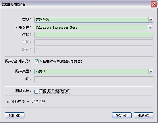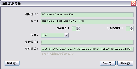进入“参数和 cookie”的高级定制参数选项卡,为校验参数定制识别模式。由于校验参数的参数名称和参数值都是动态变化的,所以我们需要定义两个定制参数,分别识别校验参数的参数名称和校验参数的参数值。如下图所示。