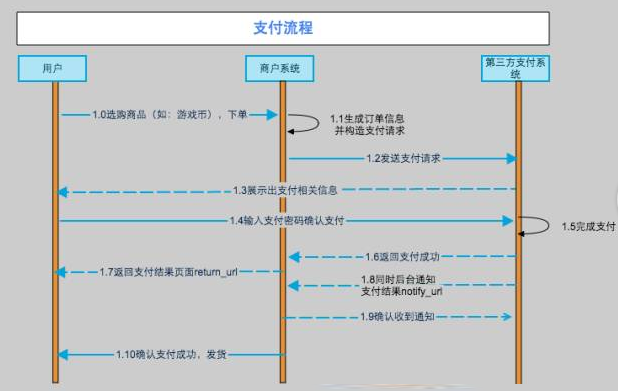 先看下流程图,是否对流程图有些了解,不仅仅是做支付功能相关测试才去搞清楚其中的流程,做其他的测试一样也要搞清楚流程,只有搞清楚流程,才能更好的评估其中的风险,才能有利于测试用例的设计。当然流程图中只是提到了商户与第三方是如何交互的,同样商户内部处理的流程也要有所了解及数据怎么存储的,涉及到哪些DB也要清楚。