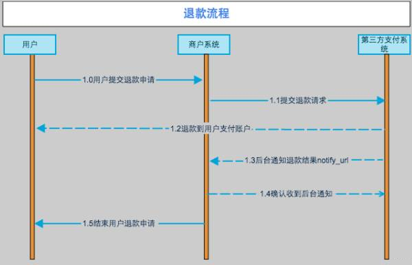 · 退款接口:调用第三方支付的支付请求接口返回付款成功后,在需要做退款处理时调用退款请求接口发起退款处理。(退款接口的终处理结果分为退款成功和退款失败,若未收到明确结果可调用退款查询接口查询结果。)