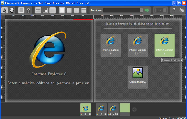 根据微软的介绍,SuperPreview的可用IE版本视系统已安装IE浏览器的版本而定,如果系统安装了IE8,那SuperPreview浏览器测试可用版本包括IE8、IE7和IE6;如果系统安装了IE7,那SuperPreview只包括IE7和IE6;如果系统安装了IE6,那SuperPreview只能测试IE6。