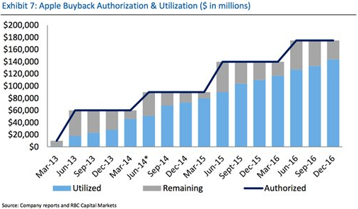 上述图表,显示了苹果迄今为止分配的金额以及在2013年3月至去年年底之间的股票回购。