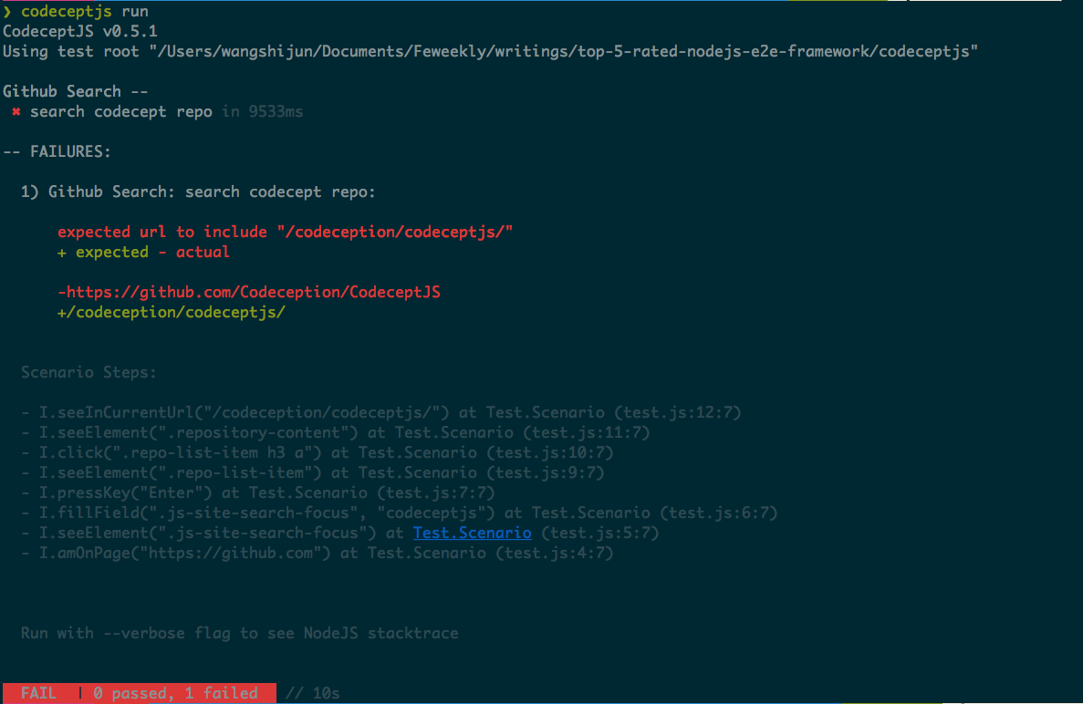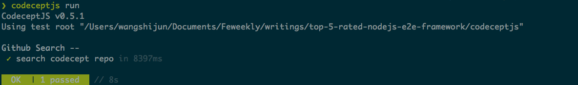CodeceptJs 让笔者比较欣赏的地方在于测试用例的组织,基于 Feature 和 Scenario 两个粒度来组织测试让它看起来更有 E2E 测试的样子,它支持新的 ES6 语法,同时也屏蔽各种复杂的回调细节,所有的测试用例都是以第一人称来做,让测试代码阅读起来更像是自然语言,而让笔者担忧的地方在于,过多的封装可能导致出问题时排查比较困难。