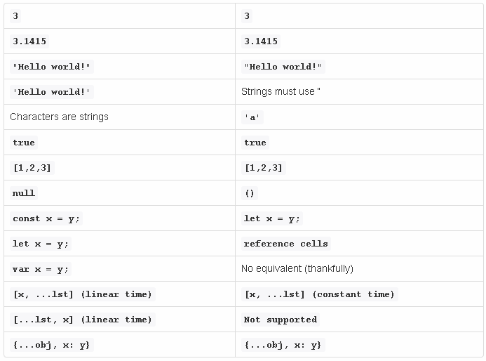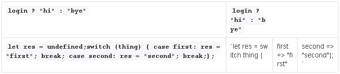 ReasonML与React师出同门,是基于OCamel设计的语法友好、编辑器支持程度高,并且有强大的编译工具支持的语言。建议阅读Sean Grove对ReasonML的介绍。本文简单介绍几个JavaScript与Reason的语法对比:
