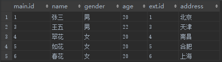 可以把这两张表看作是用来存放用户信息的, main放置主要信息,ext表放置附加信息,两张表的关系是1对1的,以id字符作为对应关系键。现在我们需要将地址不为杭州的所有用户信息筛选出来,结果中需要包含main表和ext表的所有字段数据。