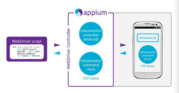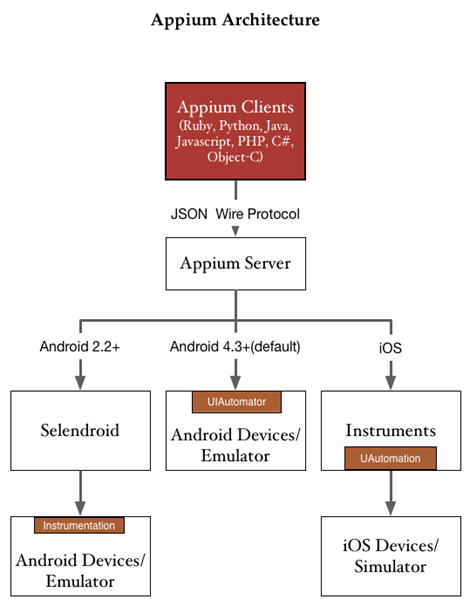 Appium Server即服务器,连接Appium客户端和移动设备。原生的webdriverapi为web端设计,因此扩展到移动端要拓展。Appium官方提供了一套appium client,涵盖多种语言ruby/java/python等。
