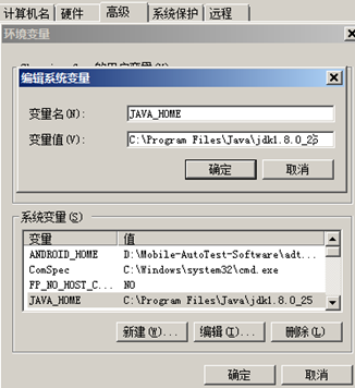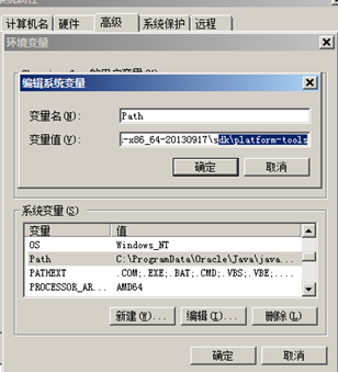 5)ADB安装:ADB是ADT的一个工具,所以,在要下一个ADT的安装包(免安装的)解压即可。然后,设置系统环境变量ANDROID_HOME为ADT所在目录(比如D:Mobile-AutoTest-Softwareadt-bundle-windows-x86_64-20130917sdk),同时把并把ADT里的tools和platform-tools两个目录加入到系统的 Path路径里:注意:adb需要安装adb驱动,一般手机驱动自带adb驱动,所以只要安装一个手机驱动即可