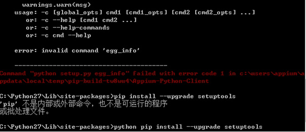 安装Appium-Python-Client客户端时有时会遇到setuptools版本问题,运行python pip install –upgrade setuptools升级后再安装: