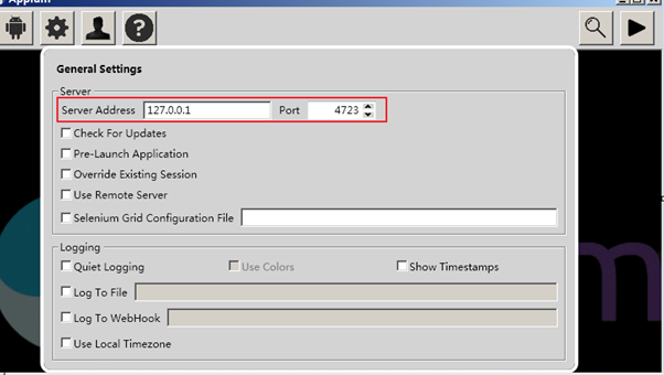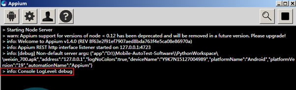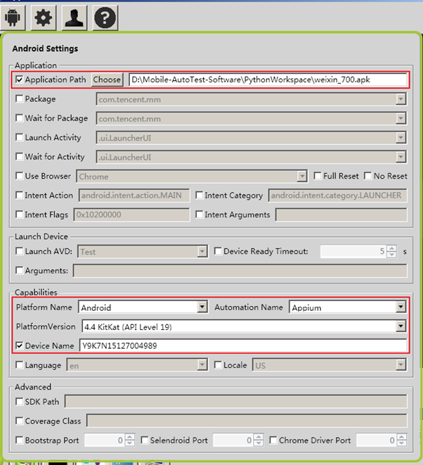 按照如上步骤安装好各软件后,基本环境算完成了。启动Appum,填写被测APP路径,Platform选Android,Automation Name选Appium,PlatformVersion根据手机的Android版本选择,DeviceName选择上面adb命令识别的手机udid号;Server地址和端口保持默认: