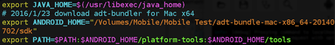 过程和Windows基本一致,JDK安装过程自行百度,python咋Mac和Linux环境下是自带的无须安装。环境变量JAVE_HOME和ANDROID_HOME设置,并把ADT里的platform-tools和tools加到系统目录: