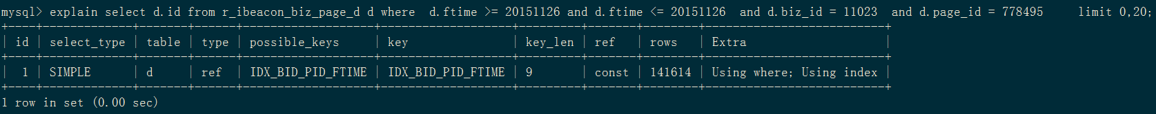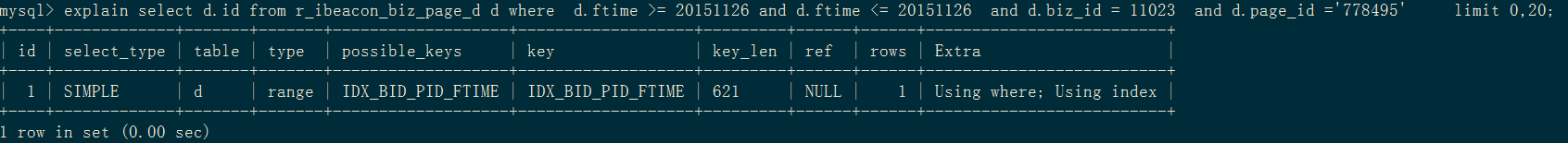 然后执行“desc r_ibeacon_biz_page_d”,查看表结构的索引字段,突然发现page_id的类型怎么是varchar,再看SQL中page_id=11023。突然意识到了什么,此时刚好违反索引匹配的第四条规则。更改SQL“page_id=11023”为“page_id=‘11023’”验证,如下